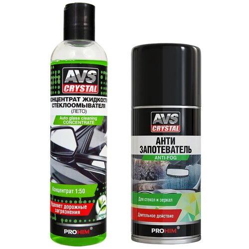 Загрязнения лобового стекла автомобиля считаются злободневной проблемой каждого автовладельца, а с наступлением теплого времени года ко всему добавляются еще следы от насекомых, затрудняющие обзор дороги. Если Вы дорожите комфортом при вождении и хотите, чтобы лобовое стекло Вашего авто было кристально чистым, то Вам на помощь придет летний омыватель стекол AVS и антизапотеватель AVS!Концентрат жидкости стеклоомывателя AVS эффективно удаляет дорожную грязь, налет и следы насекомых, улучшая обзор и повышая безопасность вождения. Благодаря своему качественному составу омывающая жидкость продлевает срок службы стеклоочистителей и гарантирует идеальную чистоту стекол и фар, не оставляя после себя радужной пленки. Омыватель безопасен для всех типов лакокрасочного покрытия, резины и пластика. Он обладает приятным и ненавязчивым ароматом зеленого чая.Одного флакона концентрата AVS достаточно для приготовления 13 литров стеклоомывающей жидкости, поэтому готового раствора Вам хватит надолго.Антизапотеватель предотвращает запотевание стекол и зеркал автомобиля, улучшает видимость. Не оставляет разводов и радужных ореолов. Состав в течение длительного времени препятствует образованию конденсата воды в виде микрокапель, которые создают эффект мутного стекла. В зимнее время года препятствует образованию инея на поверхности. Пригоден для бытового применения; Безопасен для пластиковых и резиновых элементов салона; Капли не собираются даже при высокой влажности и значительной разнице температур в салоне и на улице.Преимущества: Улучшает обзорность; Не оставляет разводов и бликов; Удобен и прост в использовании; Повышает безопасность движения; Подходит для очистки тонированных стекол; Обладает приятным ароматом зеленого чая; Придает стеклам блеск и максимальную прозрачность; Безопасен для лакокрасочного покрытия, резины и пластика; Быстро и качественно удаляет дорожную грязь, налет и следы насекомых; Благодаря качественному составу продлевает срок службы стеклоочистителей; Одного флакона достаточно для приготовления 13 литров стеклоомывающей жидкости.