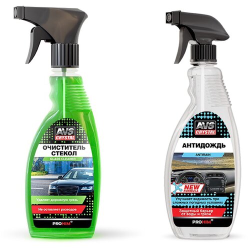 Загрязнения лобового стекла автомобиля считаются злободневной проблемой каждого автовладельца, а с наступлением теплого времени года ко всему добавляются еще следы от насекомых и капли дождя, затрудняющие обзор дороги. Если Вы дорожите комфортом при вождении и хотите, чтобы лобовое стекло Вашего авто было кристально чистым, то Вам на помощь придет комплект из очистителя стекол и антидождь New Formula AVS!Этот очиститель стекол идеально подходит для очистки наружных и внутренних поверхностей автомобильных стекол, зеркал и фар от дорожных загрязнений и следов насекомых. С внутренней стороны стекол эффективно удаляет никотиновые образования. Придает стеклам блеск без разводов, не изменяя оптических свойств стекла и улучшает обзорность и повышает безопасность движения. Безопасен для лакокрасочного покрытия, хромированных, пластиковых и резиновых поверхностей. Также он обладает антистатическим эффектом.Антидождь образует на обрабатываемой поверхности стойкую полимерную пленку. Он прекрасно подходит для обработки стёкол, зеркал, фар автомобиля, а также пластиковых визоров мотоциклетных шлемов. Образуемая пленка значительно снижает сцепление водяных капель или грязи с поверхностью. При скорости выше 60 км/ч водяные капли скатываются, оставляя стекло прозрачным.Средство обеспечивает нормальную видимость даже при сложных погодных условиях. Благодаря водоотталкивающим свойствам очистителя стекло дольше остается чистым.Преимущества очистителя стекол: Действует мгновенно; Придает стеклам блеск; Не оставляет разводов; Придает максимальную прозрачность; Удаляет дорожную грязь; Избавляет от следов насекомых; Очищает никотиновые образования.Преимущества антидождя: Прост в использовании; Стекло дольше остается чистым; Выполнен в удобной для использования форме; Образует на стекле стойкую полимерную пленку; Создает защитный барьер (пленку) от воды и грязи; Улучшает видимость при сложных погодных условиях.
