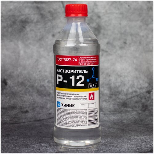 Во время проведения ремонта, покраски или стройки часто возникают ситуации, когда краску или шпаклевку требуется развести. Для этого используют специальные составы, не меняющие качеств исходного материала. Отличным помощником в данной задаче для Вас может стать Растворитель Р12.Растворитель Р12 от бренда химик, является жидкостью, которая полностью растворяет пленкообразующее вещество и испаряется в процессе сушки. Данный растворитель предназначен для разбавления лакокрасочных материалов на основе поливинилхлоридных и полихлорвиниловых хлорированных смол ПСХ ЛС, ПСХ ЛН, полиакриловых смол и других пленкообразующих веществ. С его помощью можно добиться именно той консистенции лака или краски, которая позволяет получить качественное, гладкое и ровное покрытие.Растворитель Р-12 – это незаменимое средство, которое всегда есть в арсенале мастеров, работающих над покраской автомобилей. Преимущества:Высококачественный состав;Простота в использовании;Растворитель пригоден для разбавления базовых эмалей, акриловых эмалей, лаков и грунтов.Обеспечивает оптимальную скорость высыхания и растекаемость готового материала по поверхности;Используется для очистки малярного инструмента.Не содержит ацетон, спирты, метанол;Производится по ГОСТ 7827-74;Соотношение цены и качества.Технические характеристики:Рекомендуется применять при температуре нанесения от 20-25С.Объем: 0.5 лПлотность: 0,854-0,859 г/см³Состав: толуол >30%, бутилацетат >30%, о-ксилол >5%, но <15%Температура хранения: от -40ºС до +40ºССрок годности: 24 месяцаГОСТ 7827-74Способ применения:Добавлять в лакокрасочные материалы небольшими порциями до необходимой вязкости, постоянно перемешивая, в количестве, указанном в инструкции по применению лакокрасочной продукции.Работы проводить в резиновых перчатках, защитных очках и в средствах защиты органов дыхания, в хорошо проветриваемом помещении, не допуская попадания открытого огня, курения и прямых солнечных лучей.