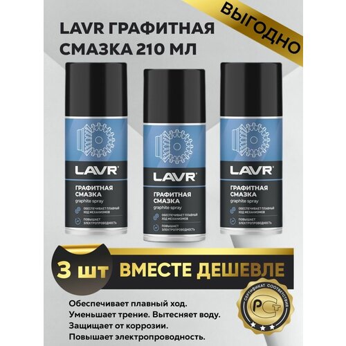 Графитная смазка LAVR 210 мл Ln1478 - проверенное средство для защиты механизмов от износа, трения и коррозии. Частицы графита заполняют и сглаживают микронеровности поверхности, предохраняют от граничного трения, тем самым увеличивая ресурс детали и предотвращая заедания. Мелкодисперсный графит сохраняется в узле дольше чем все остальные компоненты смазки, продолжая обеспечивать антифрикционные свойства. Состав применяется для обработки дета-лей автомобилей, тросов, резьбовых соединений, ходовых винтов, рессор, тихоходных подшипников, индустриального оборудования и других механизмов. Смазка предотвращает закисание и прикипание деталей. Создает электропроводное покрытие.