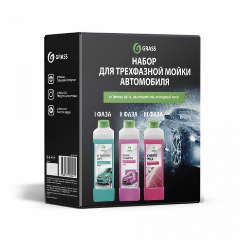 1 фаза, активная пена "Active Foam Soft". Концентрированное слабощелочное средство для бесконтактной мойки автотранспорта. Без труда удаляет дорожную пыль, грязь, масло, следы от насекомых. Легко смывается с поверхности, не причиняя вреда покрытиям из сплавов цветных металлов. Идеально подходит для мойки автомобиля в летний период. Содержит антикоррозионные добавки.2 фаза, наношампунь "Nano Shampoo". Высокопенный шампунь совмещает в себе мойку и защиту ЛКП автомобиля. Восстанавливает и придает блеск ЛКП, создает тонкую пленку, защищающую кузов от воды, грязи, обледенения. Обработанная поверхность дольше остается чистой и легко моется.3 фаза, холодный воск "Cherry Wax". Концентрированный эффективный продукт, защищающий автомобиль от внешних воздействий окружающей среды. Обладает высокой водоотталкивающей способностью, ускоряя процесс высыхания кузова после мойки. Придает дополнительный блеск и антистатические свойства. Не пачкает и не повреждает стекла.
