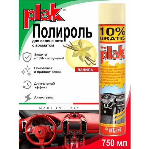 PLAK Полироль для салона авто (750 мл) - продукт проверенного качества, представлен на рынке уже около 30 лет и считается основным средством по уходу за салоном автомобиля. Полироль для пластика автомобиля на основе особых силиконов придает блеск и защищает от пыли приборную панель и детали салона из пластика, дерева и кожимита. Антистатик для автомобиля обладает антистатическим действием, отталкивает пыль. Полироль для автомобиля замедляет изнашивание деталей, очень экономичен, эффект сохраняется на длительное время, легко наносится. Кроме того, рекомендуется использовать полироль автомобиля как полироль для мебели, а также мраморных и резиновых поверхностей. Полироль для машины также может применяться и в быту для полировки мебели. Полироль Plak предназначен для ухода за приборной панелью и пластиковыми деталями салона, содержит освежитель воздуха продленного действия. Автохимия возвращает первоначальный блеск всем пластмассовым, виниловым и резиновым элементам отделки салона автомобиля, создавая на поверхности стойкий антистатический слой, отталкивающий пыль и грязь. Также полироль для автомобиля для пластика позволяет создать глянцевое покрытие. Способ применения: тщательно взболтайте содержимое баллона; распыляйте аэрозоль на поверхность с расстояния в 20-25 сантиметров; отполируйте поверхность мягкой не ворсистой тряпкой.