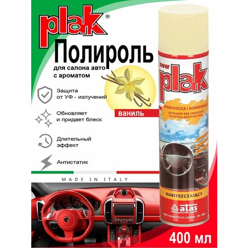 PLAK Полироль для салона авто (400 мл) - продукт проверенного качества, представлен на рынке уже около 30 лет и считается основным средством по уходу за салоном автомобиля. Полироль для пластика автомобиля на основе особых силиконов придает блеск и защищает от пыли приборную панель и детали салона из пластика, дерева и кожимита. Антистатик для автомобиля обладает антистатическим действием, отталкивает пыль. Полироль для автомобиля замедляет изнашивание деталей, очень экономичен, эффект сохраняется на длительное время, легко наносится. Кроме того, рекомендуется использовать полироль автомобиля как полироль для мебели, а также мраморных и резиновых поверхностей. Полироль для машины также может применяться и в быту для полировки мебели. Полироль Plak предназначен для ухода за приборной панелью и пластиковыми деталями салона, содержит освежитель воздуха продленного действия. Автохимия возвращает первоначальный блеск всем пластмассовым, виниловым и резиновым элементам отделки салона автомобиля, создавая на поверхности стойкий антистатический слой, отталкивающий пыль и грязь. Также полироль для автомобиля для пластика позволяет создать глянцевое покрытие. Способ применения: тщательно взболтайте содержимое баллона; распыляйте аэрозоль на поверхность с расстояния в 20-25 сантиметров; отполируйте поверхность мягкой не ворсистой тряпкой.