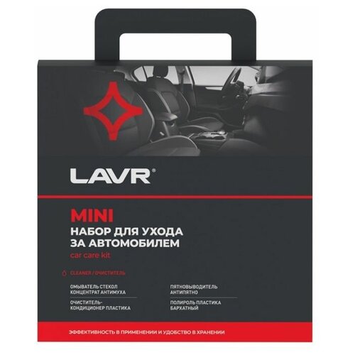 Набор для ухода за автомобилем 4х120 мл Состав набора: Омыватель стекол концентрат АнтимухаLn1225 / 120 млБыстро удаляет дорожную пыль, следы насекомых, жировые пятна и другие виды загрязнений с лобового стекла автомобиля. Не оставляет разводов и пленки после высыхания. Предохраняет систему омывания от образования вредных отложений. Уникальный высококонцентрированный и экономичный состав. Пятновыводитель АнтипятноLn1465 / 120 млЭффективно устраняет сложные пятна от сладких напитков, вина, ягод, губной помады, машинного масла, жиров, чернил и прочих загрязнений на тканевой обивке и ковровых покрытиях. Устраняет резкие запахи, освежает цвет и фактуру материалов. Не повреждает ткани, так как не содержит хлора. Для бытового и профессионального использования. Очиститель-кондиционер пластикаLn1454 / 120 млУдаляет любые виды загрязнений пластиковых, виниловых и резиновых поверхностей. Оказывает кондиционирующее действие, подготавливает пластик к полированию. Освежает салон автомобиля и устраняет неприятные запахи, в том числе въевшийся запах табака. После использования на обработанные поверхности рекомендуется нанести Полироль пластика. Полироль пластика БархатныйLn1425-L / 120 млПридает пластиковым и резиновым деталям благородный матовый оттенок. Заполняет неровности и микроцарапины, обновляя поверхности. Не оставляет разводов и жирной липкой пленки. Защищает пластик и резину от старения и выцветания на солнце. Обладает антистатическим эффектом. Перед нанесением рекомендуется очистить пластик с помощью Очиститель-кондиционер пластика.