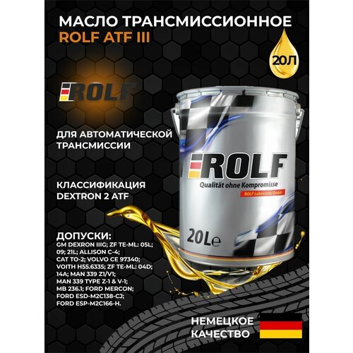 Современная высокоэффективная многофункциональная жидкость для автоматических трансмиссий. Обладает улучшенными характеристиками и идеально подходит для современных АКПП. Производится на основе высокотехнологичных базовых масел с высоким индексом вязкости. Содержит высокоэффективные антиокислительные, противоизносные, моюще-диспергирующие, противопенные присадки и специальные модификаторы трения. ROLF ATF III предназначена для большинства автоматических трансмиссий современных легковых и грузовых автомобилей, для гидроусилителей управления, где рекомендуется использование жидкостей спецификации GM Dexron III в автоматических КПП Allison, ZF, Voith, MAN и других производителей в соответствии со списком соответствий. Допускается применение в гидроусилителях рулевого управления там, где рекомендуется применение жидкостей спецификации GM ATF DEXRON III.