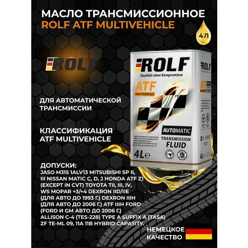 Высокоэффективная трансмиссионная жидкость для автоматических трансмиссий ROLF ATF MULTIVEHICLE изготовлена на основе синтетических базовых масел и многофункционального пакета присадок последнего поколения, что обеспечивает заданный коэффициент трения для передачи высокого крутящего момента, значительно снижает износ и предотвращает задиры. За счет применения синтетических базовых компонентов у жидкости высокий индекс вязкости, благодаря чему достигаются прекрасные низкотемпературные свойства.