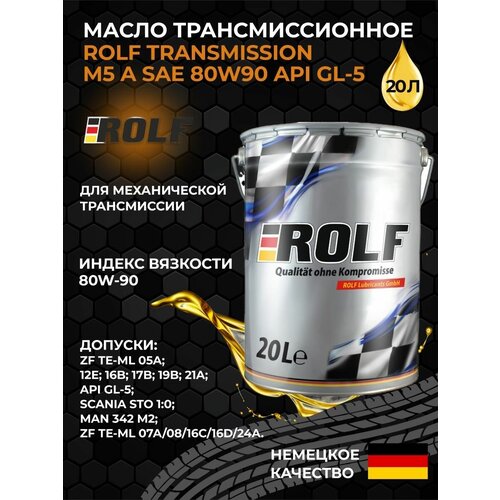 ROLF TRANSMISSION M5 A 80W-90 – минеральное трансмиссионное масло с высокими эксплуатационными характеристиками. Высокоэффективный пакет присадок обеспечивает непревзойдённые противозадирные и противоизносные свойства. ROLF TRANSMISSION M5 A 80W-90 разработано для тяжелонагруженных гипоидных передач легковых и грузовых автомобилей. Рекомендуется для всех видов автомобильных трансмиссий и дифференциалов, для которых требуется масло уровня API GL-5. Содержит высокоэффективные антиокислительные, противоизносные, моющие и противопенные присадки и специальные модификаторы трения. Прекрасные смазывающие характеристики обеспечивают стабильную масляную пленку на деталях трансмиссии, что предотвращает износ трущихся поверхностей.