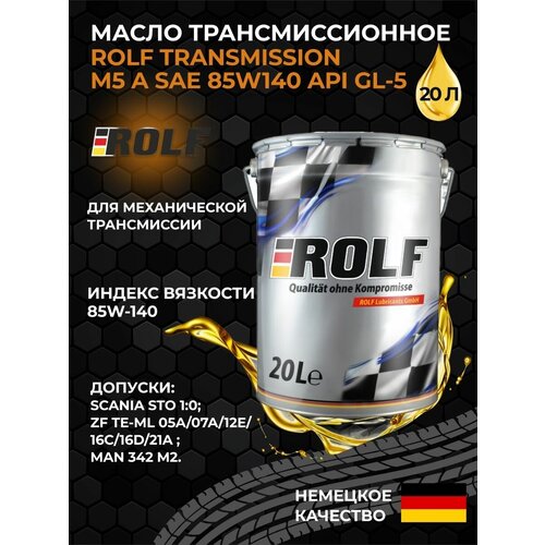 ROLF TRANSMISSION M5 A 85W-140 – высокотехнологичное трансмиссионное масло с отличными эксплуатационными характеристиками. Многофункциональный пакет присадок обеспечивает непревзойдённые противозадирные и противоизносные свойства, особенно в тяжелых условиях эксплуатации. Прекрасные смазывающие характеристики обеспечивают стабильную масляную пленку на деталях трансмиссии, что предотвращает износ трущихся поверхностей. Масло ROLF TRANSMISSION M5 A 85W-140 предназначено для смазки высоконагруженных трансмиссий шоссейных грузовых автомобилей, автобусов, строительной, дорожной, карьерной и сельскохозяйственной техники, требующих применения масел эксплуатационного класса API GL-5. Отлично подходит для смазки гипоидных передач, работающих с ударными нагрузками при высоких контактных напряжениях.