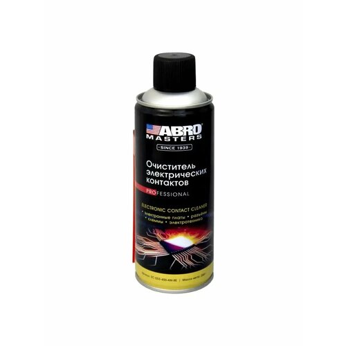 Очиститель электрических контактов 260г. Производитель ABRO MASTERSИспользуется для удаления масла, жира, грязи, окислов, влаги с электрических контактов, переключателей, клемм, розеток, электроплат, измерительных приборов и т. д.свойства• Обеспечивает защиту контактов от окисления и коррозии, предотвращает ухудшение электросигнала.• Быстро испаряется и не оставляет сухого остатка.• Безопасен для резины и большинства пластмасс.• Не содержит силиконов.• Идеально подходит для электрических блоков и контактов в автомобиле и дома, компьютеров, аудио- и видеотехники, а также любых других электрических приборов и устройств.