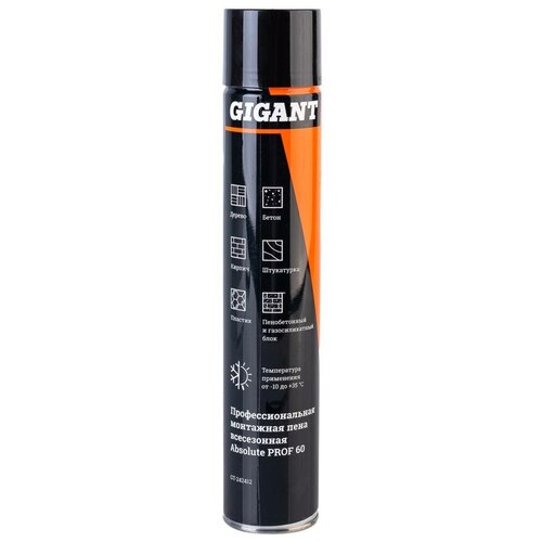 Профессиональная монтажная пена Gigant Absolute PROF 60, баллон, 750 мл, 1 шт, арт. GT-242412 Профессиональная монтажная пена Gigant Absolute PROF 60, 750 мл GT-242412 применяется для герметизации, заполнения пустот и швов при проведении ремонтных и отделочных работ. Пена полностью полимеризуется за 24 часа.Пена подходит для нанесения на конструкции из: дерева; бетона; кирпича; штукатурки; пластика; пенобетонные блоки; газосиликатные блоки.Gigant – собственная торговая марка компании ВсеИнструменты. ру, разработанная специально для требовательных мастеров. Продукция представлена профессиональными и бытовыми инструментами, имеет доступную цену и высокое качество. При изготовлении товаров Gigant используется современное оборудование и прочные материалы. Производство осуществляется на современных предприятиях России и Азии. Тестирование товаров осуществляется в два этапа, каждая партия инструментов проходит проверку на соответствие стандартам и заявленным техническим характеристикам. Это является залогом качества и надежности готового продукта. Продукция представлена широкой линейкой инструментов. У нас можно приобрести ручной инструмент, строительный, садовый, сантехнический, климатический, крепежный, автогаражный, а также станки, расходные материалы и многое другое.