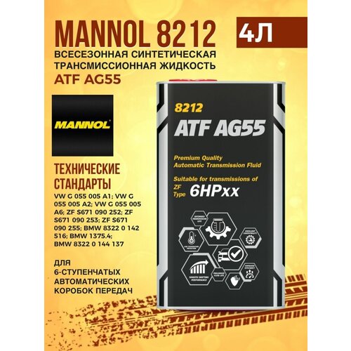 Масло трансмиссионное MANNOL Automatc Special ATF AG55 4л - специальное всесезонное трансмиссионное синтетическое масло (ATF) для нового поколения 6 ступенчатых автоматических коробок передач (АКПП) концерна ZF. Обеспечивает бесперебойную работу АКПП, гарантирует минимальный износ, продолжительный срок службы трансмиссий и экономию топлива даже при экстремальных нагрузках. Разработано с учетом специальных требований концерна VW G 055 005.Свойства продукта:- Маловязкая синтетическая основа высочайшего качества со стабильно высоким индексом вязкости в комбинации с многофункциональным пакетом присадок сохраняет все свои свойства в широком диапазоне температур: обеспечивает хорошие смазочные свойства при низких (-45 °C) температурах зимой и обеспечивает стабильную масляную плёнку при экстремальных нагрузках и температурах летом;- Высокотехнологичная комбинация присадок обеспечивает отличные антифрикционные свойства для зубчатых зацеплений и непревзойденные фрикционные свойства для фрикционных элементов, что обеспечивает существенную экономию топлива, плавное без рывков переключение передач и увеличение срока службы всех элементов трансмиссии. Обеспечивает слаженную и плавную работу сцеплений;- Предотвращает задир;- Обладает повышенной термоокислительной и химической стабильностью и стойкостью к высокотемпературной термической деградации на протяжении всего срока эксплуатации. Это позволяет снизить образование шлама, лака, нагара и других углеродистых отложений, увеличить интервал замены масла и обеспечить долговечность деталей трансмиссии, что снижает затраты на обслуживание техники;- За счёт добавления специальных ингибиторов эффективно защищает от коррозии металлические детали из черных и цветных сплавов как в процессе работы, так и в нерабочем состоянии;- Эффективно противостоит аэрации, пенообразованию и кавитации, обладает прекрасными охлаждающими свойствами. Имеет низкие потери на испарение;- Обеспечивает совместимость со всеми материалами уплотнений, предотвращает их разбухание, затвердевание и усадку, что позволяет снизить затраты на запчасти и предотвращает утечки;- Снижает шум.Рекомендовано для нового поколения 6-ти ступенчатых коробок передач концерна ZF легковых и коммерческих автомобилей Volkswagen, Audi, Seat, Skoda где требуется соответствие требованиям VW G 055 005 и вышеперечисленным спецификациям европейских производителей.Цвет: желто-коричневый.Соблюдайте предписания производителя, указанные в руководстве по эксплуатации!