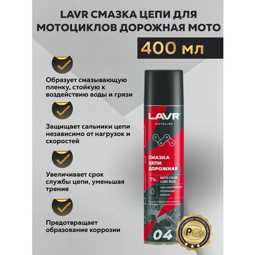 Смазка для дорожных мотоциклов аэрозоль LAVR мото 400мл - липкая синтетическая смазка для быстродвижущихся цепей мототехники. Специально разработана для дорожных мотоциклов с уплотнителями типа О-ring, X-ring, Z-ring и без уплотнителей. Образует смазывающую пленку, стойкую к воздействию воды и грязи. Защищает сальники цепи независимо от нагрузок и скоростей. Увеличивает срок службы цепи, уменьшая трение.100% СинтетическаяВосстанавливает эластичность сальниковУдерживается на цепиУменьшает износНе вымывается водойПредотвращает образование коррозииПеред обработкой цепь очистить от следов старой смазки и грязи с помощью Очистителя цепи Ln7701. Тщательно встряхнуть баллон перед использованием.1. Нанести средство тонким слоем на внутреннюю часть цепи, медленно поворачивая колесо для максимального проникновения.2. Дать средству высохнуть в течение 10 — 15 минут, после чего защитные свойства достигнут максимума. На поверхности останется прозрачная пленка.3. Удалить излишки смазки ветошью.Для достижения наилучшего результата использовать при температуре баллона выше +14°C. Избегать попадания смазки на тормозные механизмы!Общий объем баллона 400 мл: 238 мл - действующего вещества, остальное газ.