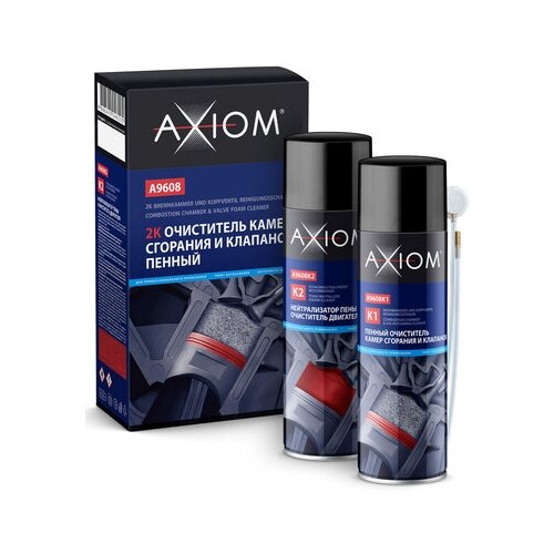 Профессиональное средство для очистки камеры сгорания, поршней и поршневых колец от смолисто-коксовых отложений. Также подходит для очистки впускных и выпускных коллекторов, клапанов EGR и турбокомпрессоров от нагара.2К очиститель камер сгорания и клапанов пенный AXIOM A9608 состоит из двух компонентов: K1 A9608K1 Пенный очиститель камер сгорания и клапанов, K2 A9608K2 Нейтрализатор пены. Очиститель двигателя.K1. Пенный очиститель камер сгорания и клапанов, при распылении образует обильную пену, что позволяет смачивать средством всю поверхность цилиндра. Активные очищающие компоненты в составе превосходно размягчают и удаляют въевшиеся углеродистые отложения, смолы и прочие загрязнения; ингибиторы коррозии защищают металл от агрессивного воздействия продуктов сгорания.СвойстваПри распылении образует обильную пену, что позволяет смачивать всю поверхность цилиндра.Восстанавливает работу компрессионных и маслосъемных колец.Восстанавливает мощность двигателя.Снижает количество вредных выбросов в атмосферу.Не оказывает влияния на уплотнители и компоненты двигателя.K2. Нейтрализатор пены, применяется после K1 (арт. A9608K1) и предназначен для удаления уже размягчённых продуктов сгорания. Связывает растворённые частицы загрязнений, предотвращает их повторное оседание на очищаемых поверхностях.СвойстваУдаляет размягчённые загрязнения.Связывает растворённые частицы загрязнений, предотвращая их повторное оседание на очищенных поверхностях.Содержит высокоэффективные смазывающие добавки, защищающие двигатель от повышенного трения во время первого пуска.Предотвращает износ механических компонентов.применение:Применение K1Прогреть двигатель до рабочей температуры.Отключить систему зажигания. Выкрутить свечи зажигания (бензиновый двигатель), форсунки или свечи накаливания (дизельный двигатель).Проворачивая коленчатый вал, установить все поршни в среднее положение.Перед использованием хорошо встряхнуть баллон K1 (НЕ менее 1 минуты).Используя удлинительный зонд, распылить К1 в цилиндры до полного заполнения пеной.Через 15 минут заполнить камеру составом повторно.Повторить прошлый пункт.Дать подействовать составу ещё 30 минут.Удалить из камеры сгорания отработанные продукты с помощью шприца с удлинительным шлангом или специальным инструментом.После откачки К1 применить K2.Применение K2Хорошо встряхнуть баллон K2.Используя удлинительный зонд распылять K2 в течение 10 секунд по всей высоте цилиндра для предотвращения оседания частиц загрязнений после использования K1.Удалить из камеры сгорания отработанные продукты при помощи шприца с удлинительной трубкой или специального инструмента.Снова хорошо встряхнуть баллон К2 и повторить пункты 2–3.Укрыть салфетками или ветошью свечные колодцы, чтобы защитить моторный отсек от разбрызгивания состава, прокрутить стартером в течение 10 секунд.Установить свечи (форсунки) на место и восстановить систему зажигания.Заменить масло и фильтр в двигателе.Запустить двигатель и дать ему поработать на холостых оборотах 10–15 минут.Внимание! С осторожностью применять на двигателях со значительным износом и высокой степенью загрязнения! Не использовать дольше рекомендуемого времени! Для достижения наилучших результатов применять при температуре окружающей среды не ниже +10°С. Не переворачивать 