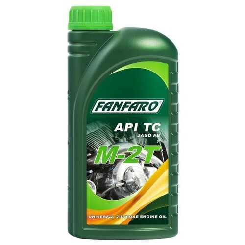 Моторное масло FANFARO M-2T, API TC, JASO FB, минеральное, 1 л.Универсальное высококачественное моторное масло на минеральное основе для современных высоконагруженных и высокооборотных двухтактных двигателей с воздушным охлаждением. Подходит для смазки предварительно-подготовленной смесью и автоматическим смешиванием в воздухозаборнике двигателя.Свойства продукта:- Современный пакет присадок и высокоочищенная основа обеспечивают устойчивую работу двигателя при любых условиях применения, в том числе высоких температурах и нагрузках, предотвращает образование нагара, лака и кокса на стенках камеры сгорания, на поршнях, свечах и клапанах, выпускном коллекторе и выхлопной трубе, предотвращает закоксовывание и залегание поршневых колец, что увеличивает срок службы двигателя;- Специальная формула масла обеспечивает полное и бездымное сгорание и препятствует калильному зажиганию;- Специальные моющие компоненты поддерживают в чистоте детали двигателя;- Моментально образует очень стабильную смесь со всеми видами топлива даже при низких температурах;- Обладает отличными антикоррозионными, противоизносными и антифрикционными характеристиками, предотвращает износ и задиры на стенках цилиндров даже при экстремальных нагрузках.Предназначено для использования во всех видах двухтактных двигателей: мотоциклов, мопедов, скутеров и мотороллеров и другой мототехники, требующих применения масел уровня API TC и JASO FB.Необходимо соблюдать пропорции топливно-масляной смеси рекомендуемые изготовителями двигателей. В случае отсутствия таковых – рекомендуемая пропорция 1:50.Соблюдайте предписания производителя, указанные в руководстве по эксплуатации двигателя!Окрашено в зеленый цвет для визуального контроля масла в смеси.