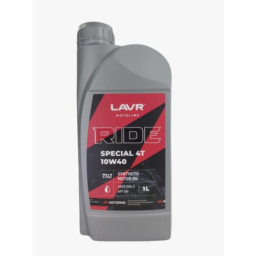 Моторное масло LAVR MOTO RIDE SPECIAL 4Т, SAE 10W-40, API SN, синтетическое, 1 л.Синтетическое моторное масло, специально разработанное для мотоциклов с четырёхтактными высокопроизводительными двигателями самых современных мотоциклов, где необходим уровень эксплуатационных свойств API SN или ниже и JASO MA/MA2. Масло демонстрирует стабильные эксплуатационные характеристики при любых условиях работы двигателя, таких как высокотемпературные режимы работы, езда по трассе на большие расстояния, городское вождение в режиме «старт-стоп», внедорожное использование техники.Специальный пакет присадок и синтетическая основа обеспечивают высокий коэффициент трения в фрикционных элементах, что позволяет избежать их износа за счёт предотвращения проскальзывания и обеспечивают четкость и плавность работы сцепления при трогании, разгоне и движении с постоянной скоростью, что позволяет легко переключать передачи.