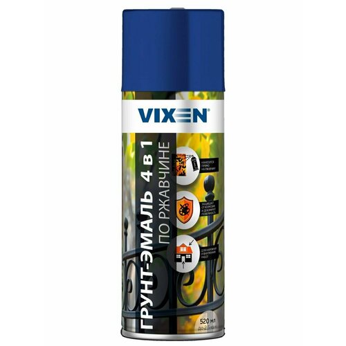 Грунт-эмаль по ржавчине RAL 5005 Сигнальный синий 520мл аэрозоль 4 в 1 Быстросохнущая грунт-эмаль по ржавчине 4 в 1 VIXEN объединяет свойства грунта, антикоррозийного покрытия, декоративной эмали и защитного лака. Предназначена для окрашивания заржавевших или подверженных коррозии поверхностей. Экономит время на окрашивание, позволяя легко и быстро обновить внешний вид изделия.Обладает хорошим сцеплением с любыми типами поверхности (металл, дерево, стекло, камень) даже при нанесении на ржавчину. Образует прочное покрытие с долговременной защитой от коррозии, высокими декоративными свойствами и стойкостью к механическим и атмосферным воздействиям. Не выгорает под действием УФ-лучей, не растрескивается и не отслаивается, сохраняет эластичность. Обладает повышенной укрывистостью, благодаря чему экономична в использовании. Не стекает при равномерном нанесении.Может использоваться для внутренних и внешних работ.