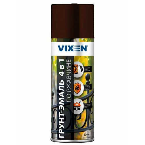 Грунт-эмаль по ржавчине RAL 8017 Шоколадно-коричневая 520мл аэрозоль 4 в 1 Быстросохнущая грунт-эмаль по ржавчине 4 в 1 VIXEN объединяет свойства грунта, антикоррозийного покрытия, декоративной эмали и защитного лака. Предназначена для окрашивания заржавевших или подверженных коррозии поверхностей. Экономит время на окрашивание, позволяя легко и быстро обновить внешний вид изделия.Обладает хорошим сцеплением с любыми типами поверхности (металл, дерево, стекло, камень) даже при нанесении на ржавчину. Образует прочное покрытие с долговременной защитой от коррозии, высокими декоративными свойствами и стойкостью к механическим и атмосферным воздействиям. Не выгорает под действием УФ-лучей, не растрескивается и не отслаивается, сохраняет эластичность. Обладает повышенной укрывистостью, благодаря чему экономична в использовании. Не стекает при равномерном нанесении.Может использоваться для внутренних и внешних работ.