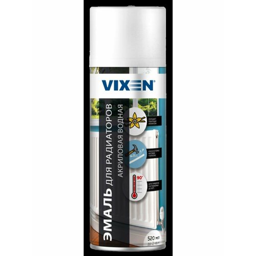 Краска-спрей эмаль для радиаторов отопления акриловая на водной основе белая 520мл аэрозоль VIXENВысокопрочная ультрасовременная акриловая эмаль на водной основе для окрашивания радиаторов отопления, труб, водонагревателей и других поверхностей, нагреваемых до +90°C.Эмаль ароматизирована, обладает легким приятным ароматом, что обеспечивает комфортное использование внутри помещений.Образует белоснежное матовое покрытие, не желтеющее со временем и устойчивое к воздействию моющих средств. Значительно обновляет внешний вид поверхности и защищает от коррозии.Обладает отличным сцеплением с окрашиваемой поверхностью, повышенной укрывистостью, что экономит ее расход. Эмаль атмосферостойка, поэтому ее можно использовать для внешних работ.Аэрозольная упаковка обеспечивает равномерное нанесение и позволяет качественно прокрашивать изделия со сложной геометрией.Не требует предварительного грунтования.