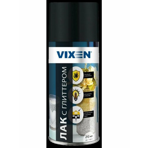 Лак Vixen с глиттером 210мл Серебро Лак образует декоративное покрытие с интенсивным мерцающим блеском, придает изделию праздничный внешний вид. Продукт идеально подходит для декорирования предметов интерьера, различных украшений, новогодних игрушек и т. д. Совместим с любыми поверхностями - стеклом и пластиком, металлом и деревом, бетоном и кирпичом, керамикой и прочими.Содержащиеся в лаке мелкодисперсные блестки эффектно искрятся и переливаются при попадании на них источника света. Лак обладает отличной адгезией к окрашиваемой поверхности, не трескается и не отшелушивается. Образует прочное покрытие, которое быстро высыхает. Обладает стойкостью к механическим и атмосферным воздействиям. Придает поверхности защитные свойства, предупреждая процесс коррозии и биологических поражений. Не стекает при нанесении на вертикальные поверхности. Благодаря аэрозольной форме упаковки лак равномерно ложится и легко наносится даже на поверхности со сложной геометрией.На колпаке представлен натуральный выкрас лака в 2 слоя на чёрном фоне