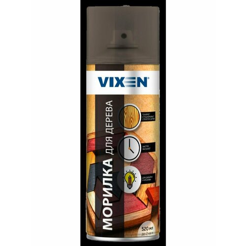 Морилка для дерева 520мл Орех аэрозоль VIXEN Аэрозольная морилка для дерева VIXEN позволяет быстро и легко обработать поверхность древесины, усилить ее естественный цвет или придать благородный внешний вид. Средство проникает в поры дерева, таким образом, проявляя красивую ярко выраженную структуру поверхности.