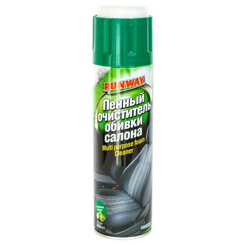 Пенный очиститель обивки салона в аэрозоле с крышкой-щеткой. Предназначен для удаления разнообразных загрязнений и пятен с изделий из ткани, велюра, ковровых покрытий и т. п. Быстро удаляет даже глубоко въевшуюся грязь. Удаляет неприятные запахи и освежает воздух в салоне автомобиля. Придает материалам антистатические свойства. Очиститель RUNWAY удаляет большинство свежих пятен от чая, кофе, молока, соков, крови, губной помады, машинного масла и т. д. Применяется для очистки всего интерьера автомобиля, включая виниловые и пластиковые обивки, панель приборов, молдинги.
