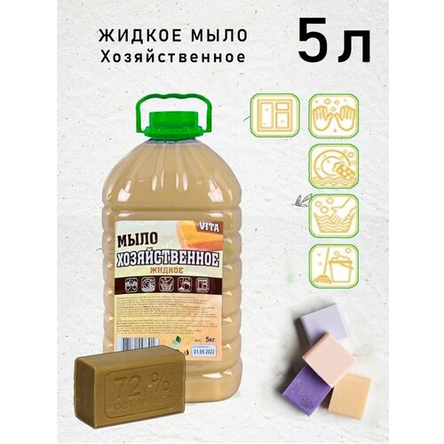 Жидкое мыло хозяйственное 5 литров нежно и бережно очищает кожу рук во время мытья. Обладает приятным запахом. Смягчает кожу рук. Мыло можно использовать в диспенсере или дозаторе для мыла, поскольку он обладает хорошей текучестью и хорошо пенится. При использовании в дозаторе образуется пенка. Жидкое мыло для рук VITA 5 литров (5000 мл) обладает увлажняющим и питающим эффектом. Натуральные компоненты мыла в канистре 5л. VITA не только уничтожают микробы, бактерии и вирусы, но защищают кожу вашего тела и рук. Жидкий матовый концентрат средства обладает приятным запахом, что позволяет наслаждаться каждым умыванием. Оно не вызывает раздражения, а наоборот снимает его, питая кожу, а наши компоненты оказывают отличное увлажняющее действие. Жидкое мыло в баллоне 5л. имеет матовую мягкую консистенцию. При использовании туалетного мыла образуется нежная густая пенка, которая бережно очищает ваши руки. Так же наличие хорошей пены позволяет назвать средство экономным за счет оптимального расхода. Жидкое мыло антибактериальное сертифицировано и проверено множеством тестов, полностью безопасно и подходит для взрослых и детей. Его можно использовать для дачи, в офисе, в общественном туалете, ванной комнате, душе и других местах, так же можно мыть фрукты. Подходит для ежедневного мытья рук, лица, тела. Обладает хорошим моющим и очищающим эффектом, экономично в использовании. Обладает приятным запахом. Может быть хорошим подарком. Можно использовать в бане. Мы выбираем мыло России.