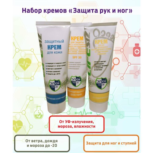 Набор кремов Элен "Защита рук и ног".крем защитный от обморожения И обветривания туба 100 мл. Крем предназначен для защиты кожи рук, лица и других открытых участков тела от обморожения и обветривания при длительном нахождении на открытом воздухе в условиях низких температур, сопровождающихся ветром, снегом и повышенной влажностью. В структуру крема входят естественные составляющие, обеспечивающие восстановление естественных предохранительных свойств кожи, препятствующие шелушению, покраснению, появлению трещин, сухости кожи, ощущения покалывания, жжения и стянутости. Содержит в своем составе карбамид натуральный влагосодержащей фактор (NMF) который обеспечивает целостность баланса влаги в коже, благодаря чему улучшает состояние водного баланса рогового слоя и делает кожу мягкой и шелковистой. Входящее в состав пальмовое масло обладает противовоспалительным, увлажняющим, антиоксидантным, тонизирующим действием. При нанесении крема, появляется невидимая морозозащитная пленка, не нарушающая естественного дыхания кожи, которая оберегает поверхностные и глубокие слои от потери влаги. При нанесении крем хорошо впитывается, не вызывая на коже чувств жирности и липкости. Способ применения: Необходимое количество крема нанести на сухую, чистую кожу и втереть массирующими движениями. Крем необходимо наносить за 20-30 минут до выхода на улицу. Разрешается использование крема несколько раз в день.крем для защиты от УФ лучей туба 100 мл. Образует на коже защитную, отражающую УФ-излучение, воздухопроницаемую пленку. Восстанавливает естественные защитные функции кожи. Входящие в состав витамины Е и А оказывают смягчающее и увлажняющее действие на кожу, а Провитамин В5 (D-Panthenol) способствует регенерации кожи, является противовоспалительным, ранозаживляющим средством. Крем легко распределяется по коже и быстро впитывается без ощущения липкости после нанесения. Не оставляет отпечатков на рабочих поверхностях. Не содержит аллергенов, подходит для чувствительной кожи.дезодорирующий крем для НОГ туба 100мл. Крем для защиты от бактериологических вредных факторов, микроорганизмов, предотвращает образование болезнетворных бактерий, обеспечивая при этом специальный уход за кожей ног и ступней. Смягчает, питает, регенерирует, дезодорирует кожу. Благодаря входящему в состав крема витамина F происходит быстрое устранение микротрещин, улучшаются обменные процессы. Д-пантенол ускоряет регенерацию кожи. Касторовое мало оказывает фунгицидное действие. При постоянном применении улучшает естественную защитную функцию кожи, предотвращает огрубление и растрескивание кожи. Он отлично впитывается, не вызывает дискомфорта, чувства липкости и жирности ног. Позволяет лучше справляться с профессиональными нагрузками. Создан для комплексного ухода за кожей ног и ступней. Крем для ног рекомендуется использовать перед началом либо после окончания работ в закрытой обуви. Применение: На чистые сухие ноги необходимо нанести небольшое количество (0,5 - 1 мл.) антисептического крема для ног. Равномерно растереть крем по коже ног и ступней, особое внимание стоит уделить труднодоступным местам между пальцев и вокруг ногтей. Крем рекомендуется использовать в качестве профилактического. Состав INCI: вода подготовленная, масло кукурузное, тальк, цетеарилов