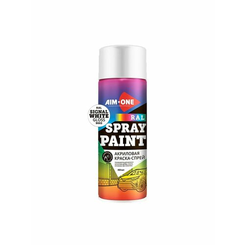 Spray paint signal white gloss — акриловая краска сигнально-белая глянцевая, предназначенная для финишного окрашивания металлических, стеклянных, деревянных, керамических поверхностей, а также ABS-пластика. Продукт может использоваться в процессе ремонта автомобиля, в быту и других сферах. Спрей предлагается в удобном баллоне объемом 450 мл с качественным распылителем.преимущества краски AIM-ONE:универсальное применение (для разных типов поверхностей);качественное распыление;отличная адгезия;быстро высыхает;устойчивость к негативным атмосферным воздействиям.удобная И долговечная краскаАэрозоль Spray paint легко наносится нажатием на кнопку баллона. Краска быстро и крепко ложится на обрабатываемую поверхность. Распылитель Aim-One обеспечивает высокую скорость и точность нанесения. Кроме того, достигается экономный расход спрея. Полученный после нанесения слой прочен и долговечен: он стойко выдерживает солнечное излучение, атмосферные осадки, легкие удары, давление и трение. Краска Spray paint signal white gloss образует на поверхности ровный слой глянцевого белого цвета. Материал не подвержен выцветанию и коррозии.