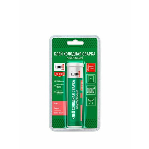 Клей холодная сварка KUDO универсальный 60гДвухкомпонентный полимерный состав повышенной вязкости предназначен для быстрого, прочного и герметичного склеивания изделий из металла, стекла, керамики, дерева и большинства пластиков. Незаменим, когда применение сварочных работ нецелесообразно или невозможно.Прост и экономичен в использовании. Применяется для ремонта инструмента, садового инвентаря, сантехники, труб горячего и холодного водоснабжения, других изделий бытового назначения. Препятствует возникновению гальванической коррозии на границе склеивания металлов.Отверждённый состав характеризуется высокой герметичностью и прочностью, выдерживает значительные статические и динамические нагрузки, а также механическую обработку (шлифовку, сверление, нарезку резьбы). Устойчив к воздействию воды, антифриза, масел и других технических жидкостей. Температурный диапазон эксплуатации отремонтированного изделия от –60°C до +150°C.