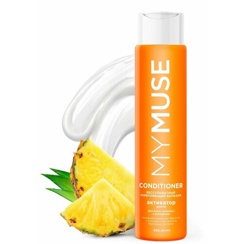 Укрепляющий бальзам активатор роста 400 мл MY MUSE. Укрепляющий бальзам Активатор роста. Для волос склонных к выпадению, содержитактивный концентрат фруктов и коллаген. Ананас содержит большое количество витамина C, мощный антиоксидант, который борется со свободными радикалами и останавливает выпадение волос, а так же питательные вещества иминералы, обеспечивающие усиление питания волосяных фолликулов и их укрепление и здоровому росту волос. Молочные протеины эффективно питают волосы, а также способствуют их росту и регенерации. Коллаген препятствует появлению ломкости и выпадению волос, стимулирует рост и поддерживает здоровье волосяных луковиц, обеспечивая активное питание и восстановление.