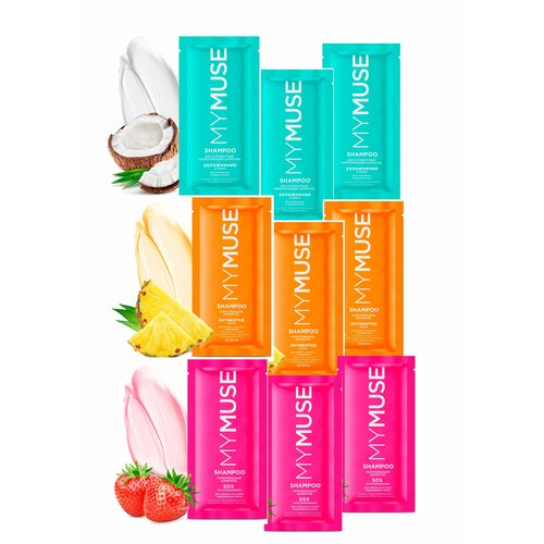 Укрепляющий шампунь SOS-восстановление MY MUSE, Укрепляющий шампунь активатор роста, Беcсульфатный укрепляющий шампунь (саше 20 мл - 9 шт.)Коллаген - незаменимый помощник в борьбе с ломкими и выпадающими волосами. Он стимулирует рост волос, укрепляет их луковицы, обеспечивает активное питание и восстановление волос.Молочные протеины - отличный источник питания для волос. Они активизируют рост и способствуют их регенерации.Сок ананаса содержит большое количество витамина C, питательных веществ и минералов. Витамин C служит мощным антиоксидантом, который предотвращает выпадение волос. Питательные вещества и минералы в свою очередь укрепляют волосяные луковицы и обеспечивают им усиленное питание для здорового роста волос.Кератин - необходимый элемент в уходе за волосами. Он увлажняет и питает волосы, улучшает их структуру.Сок клубники - отличное средство для увлажнения волос, придающее им блеск и восстанавливающее структуру.Бетаин - эффективное средство для укрепления волос и придания им естественного блеска.Комплекс аминокислот (цистеин, аргинин, метионин, лизин) защищает фолликулы волос, улучшает их структуру и прочность. Он активизирует кровоток и обеспечивает фолликулы питательными веществами, что предотвращает ломкость и выпадение, стимулирует рост и восстанавливает поврежденную структуру волос.Масло макадамии - источник влаги для волос, оживляющий их. Оно предотвращает тусклость и придает волосам здоровый блеск. После применения волосы становятся мягкими и приятными на ощупь