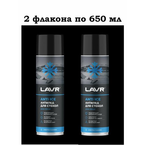 Размораживатель стекол (Антилед) 650мл - 2 шт. Размораживатель стекол Антилед LAVR - профессиональное средство в аэрозольном формате для удаления снега и льда с ветрового стекла, щеток стеклоочистителя, зеркал, фар и кузова. Безопасно очищает поверхности и предотвращает появление царапин при удалении снега и льда стеклоочистителями или скребком. Также восстанавливает эффективность работы щеток.- Не содержит метанол- Эффективно размягчает и растворяет лед и снег- Защищает от образования наледи- Абсолютно безопасен для лакокрасочного покрытия, хромированных, резиновых и пластиковых деталей- Не оставляет разводов и не создает бликов на стекле