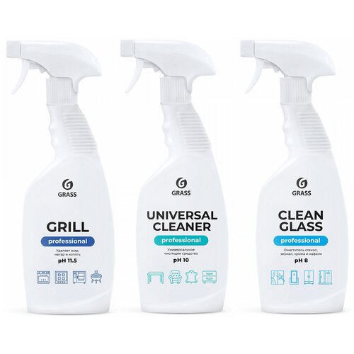 Комплект профессиональных средств для уборки состоит из: 1. Чистящее средство "Grill" Professional (флакон 600 мл) Высокоэффективное щелочное средство для очистки пароконвектоматов, печей, грилей, кухонных плит, фритюрниц, жарочного оборудования и посуды, духовых шкафов, вытяжных зонтов от стойких пищевых и органических загрязнений: нагаров, жира, копоти и пригоревшей пищи. Средство предназначено для использованияна эмалированных, хромированных поверхностях, изделиях из стекла, нержавеющей стали, чугуна, фаянса, фарфора. Содержит активные чистящие компоненты, расщепляющие жир, нагар и др. органические загрязнения, действие которых гарантирует отличный результат без особых усилий. Удаляет неприятные запахи. 2. Универсальное чистящее средство "Universal Cleaner Professional" (флакон 600 мл) Универсальное чистящее средство широкого спектра действия. Эффективно удаляет различные загрязнения с водостойких поверхностей: линолеума, полимерных покрытий, керамической плитки, ламината, паркета, дерева, нержавеющей стали, стеклянных поверхностей, а также изделий из ткани и кожи, не повреждая волокон тканей. Эффективное средство для регулярной уборки, подходит и для сильно загрязненных поверхностей. Не оставляет разводов. Устраняет неприятные запахи. 3. Очиститель стекол и зеркал "Clean Glass" Professional (флакон 600 мл) Универсальный очиститель для стекол, зеркал, пластика и хрома, изделий из хрусталя, керамики и фарфора. Может применяться для чистки экрана монитора и телевизора, корпусной мебели и торгового оборудования. Придает поверхности антистатические свойства. Не оставляет царапин, обеспечивает максимальную прозрачность без разводов и потеков.