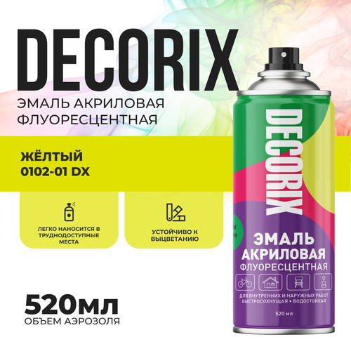 Эмаль аэроз. DECORIX акрил. флуоресцентная желтая F201 520млВысококачественная универсальная акриловая эмаль с флуоресцентным эффектом DECORIX используется в декоративно-оформительских работах, строительстве и ремонте.Предназначена для окрашивания: древесины, пластика, металла, бетона, кирпича, керамики, стекла, картона, минеральных поверхностей. При попадании света эмаль излучает ярко-сигнальный цвет. Применяется для создания надписей и изображений с целью улучшения видимости при эксплуатации и создания контрастных эффектов в росписи интерьеров. Больший эффект достигается при нанесении на белую поверхность.Аэрозольная эмаль удобна для окрашивания небольших поверхностей и труднодоступных мест. Образует гладкое, устойчивое к выцветанию покрытие.