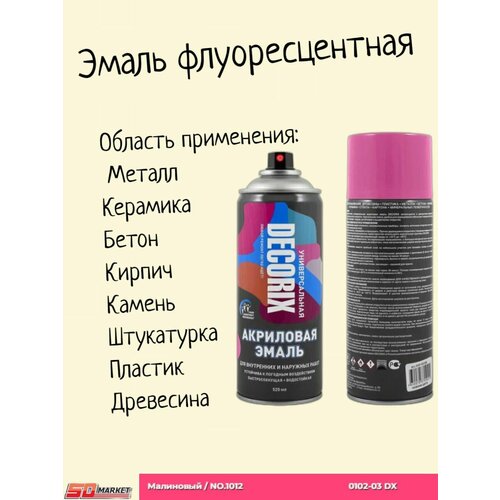 Эмаль аэроз. DECORIX акрил. флуоресцентная малиновая NO1012 520млВысококачественная универсальная акриловая эмаль с флуоресцентным эффектом DECORIX используется в декоративно-оформительских работах, строительстве и ремонте.Предназначена для окрашивания: древесины, пластика, металла, бетона, кирпича, керамики, стекла, картона, минеральных поверхностей. При попадании света эмаль излучает ярко-сигнальный цвет. Применяется для создания надписей и изображений с целью улучшения видимости при эксплуатации и создания контрастных эффектов в росписи интерьеров. Больший эффект достигается при нанесении на белую поверхность.Аэрозольная эмаль удобна для окрашивания небольших поверхностей и труднодоступных мест. Образует гладкое, устойчивое к выцветанию покрытие.