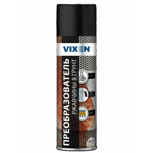 Преобразователь ржавчины в грунт VX23051 VIXEN 650мл аэрозоль Высокоэффективный состав для нейтрализации ржавчины и предотвращения ее повторного появления при подготовке металлических поверхностей к окрашиванию.Преобразует ржавчину в прочное влагозащитное покрытие, предотвращая появление подпленочной коррозии. После высыхания формирует готовое к покраске покрытие темного цвета.Обеспечивает высокую адгезию поверхности к любым шпатлевкам, грунтам и эмалям. Не требует смывания водой. При необходимости легко шлифуется. Расход1 баллон на 2-2,5 кв. м в зависимости от количества слоевРекомендуемое количество слоев 2-3 Не допускать попадания состава на лакокрасочное покрытие. Перед проведением работ защитите поверхности, не подлежащие обработке.Для достижения наилучших результатов работы производить при температуре окружающей среды от +10 до +30 °C.Подготовьте поверхность перед использованием преобразователя ржавчины: очистите от грязи, удалите рыхлую и отслаивающуюся ржавчину металлической щеткой, хорошо просушите и обезжирьте. Для обезжиривания рекомендуем использовать «Обезжириватель универсальный» Энергично встряхните баллон в течение 1-2 минут. Нанесите продукт с расстояния 20-30 см в 2-3 тонких слоя с промежуточной сушкой 2 минуты, избегая при этом образование капель и потеков. В промежутках между нанесением встряхивайте баллон.Перед нанесением лакокрасочных материалов рекомендуется хорошо просушить поверхность в течение суток. При необходимости перед окрашиванием обработайте поверхность мелкозернистой наждачной бумагой и нанесите грунт.Во избежание засорения головки распылителя по окончании работ продуйте сопло, перевернуть баллон вверх дном и выпустив остатки состава из сопла.