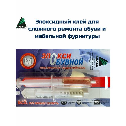 Эпоксидный двухкомпонентный клей анлесВысоко-эластичный, ударостойкий , сложный ремонт обувиОбласть применения:Сложный ремонт обуви (приклеивание ранта, заделка трещин в подошвах, каблуках, формирование ребристого наката, фиксация металлических набоек и подковок)Ремонт обувной и мебельной фурнитурыЭластичное склеивание однородных и разнородных материалов (металлов, пластмасс, дерева, стекла, керамики, фарфора, бетона)Заполнение трещин, раковин, порВыравнивание поверхностейПредставляет собой двухкомпонентный состав, состоящий из очищенной композиции на основе эпоксидных смол и отвердителя аминного типа. Состав: эпоксикаучуковая смола, аминный отвердитель, активный разбавитель. Свойства: - прекрасные оптические характеристики (бесцветность, прозрачность, глянец); - низкая вязкость (легко растекается тонким слоем); - атмосферостойкость в любых климатических условиях; - стойкость к действию воды, разбавленных кислот и щелочей, масел, бензина; - электроизоляционные свойства; - сохранение свойств в диапазоне температур от 40 до +100 С. Использовать клей при температуре не ниже 10 С. При загустении прогреть емкость со смолой при 30-40 С. Обрабатываемые поверхности зачистить, обезжирить и высушить. Непосредственно перед применением клея тщательно смешать смолу и отвердитель в соотношении 10:1,8. Шпателем или другим инструментом нанести клей и зафиксировать обрабатываемые детали на 10-12 часов. Излишки клея удалить тампоном, смоченным в ацетоне или лезвием. Нагревание до 60-70 С ускоряет процесс отверждения и повышает прочность соединения. Вызывает раздражение кожи и серьезное раздражение глаз. Использовать средства защиты. Работать в хорошо проветриваемом помещении. При работе не допускается прием пищи и курение. При попадании на кожу промыть теплой водой с моющим средством. Не рекомендуется смывать клей с кожи органическими растворителями. Не склеивать предметы для пищевых продуктов. Срок годности 3 года.