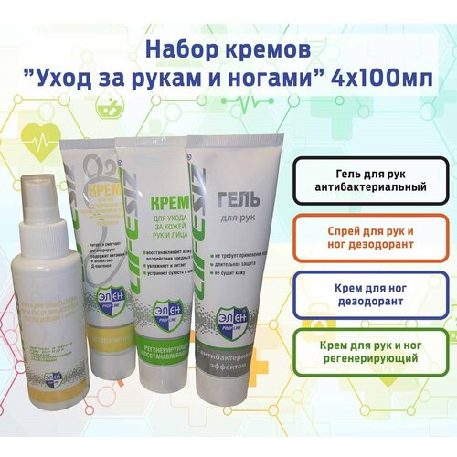 Набор кремов Элен "Уход за руками и ногами" 4 тубы по 100 мл.гель для РУК антибактериальный для быстрой дезинфекции кожи без использования воды при нахождении рабочего места удаленно от стационарных санитарно-бытовых узлов, при работе с бактериально опасными средами. Применяется на производствах с повышенными требованиями к стерильности рук работающих, в лечебно-профилактических, дошкольных и школьных учреждениях, на предприятиях общественного питания и пищевой промышленности, в банках, офисах, местах общего пользования, в быту.спрей для РУК И НОГ дезодорант предназначен для эффективного предотвращения чрезмерного потоотделения и неприятного запаха кожи ног, рук. Способствует сужению пор и подавлению работы потовых желез. Эффективен в борьбе с повышенным потоотделением, показатель выделения влаги при применении спрея-антиперспиранта существенно снижается. Прекрасно защищает от развития бактерий и абсорбирует запах. Хорошо дезодорирует, ухаживает за кожей даже при длительном нахождении в закрытой обуви, перчатках.дезодорирующий крем для НОГ предотвращает образование болезнетворных бактерий, обеспечивая при этом специальный уход за кожей ног и ступней. Смягчает, питает, регенерирует, дезодорирует кожу. Благодаря входящему в состав крема витамина F происходит быстрое устранение микротрещин, улучшаются обменные процессы. Д-пантенол ускоряет регенерацию кожи. Касторовое мало оказывает фунгицидное действие, предотвращает огрубление и растрескивание кожи. Крем для ног рекомендуется использовать перед началом либо после окончания работ в закрытой обуви. В зимнее время наносить не менее чем за 20 минут до выхода на улицу.крем для РУК И НОГ регенерирующий для комплексного ухода за кожей рук и ног, питает и восстанавливает кожу после работы в контакте с вредными водорастворимыми, водонерастворимыми и комбинированными химическими веществами, помогает и при негативном влиянии окружающей среды (ветер, дождь, снег, низкие и высокие температуры), работа с грунтами.