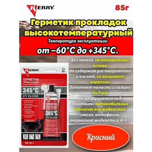 Герметик прокладок высокотемпературный KERRY нейтральный красный RTV SILICONE KR-146-1 применяется для ремонта или формирования прокладок в узлах автомобиля, подверженных воздействию высоких температур, таких как крышка картера/поддон КПП, поддон картера двигателя, корпус термостата, водяная помпа. Может наноситься на штатные прокладки для улучшения их эксплуатационных свойств (не рекомендуется для применения на головке блока цилиндров).Не содержит растворителей и кислот, не вызывает коррозиии, безопасен для кислородных датчиков. Может использоваться для герметизации электрических соединений и датчиков. Характеризуется отличной адгезией к поверхностям из металла, пластика, стекла, резины. Силиконовый атогерметик подходит для герметизации и ремонта автомобильных фар, устраняет течи через уплотнители автомобильных стёкол. Вулканизируется при комнатной температуре (RTV), образует прочную гибкую прокладку. Не растрескивается и не даёт усадку.
