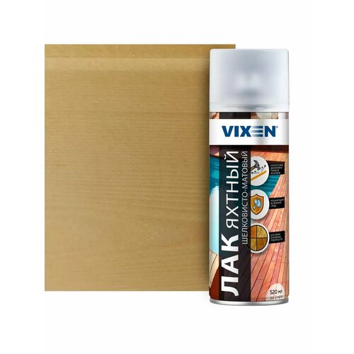 Лак яхтный Vixen — универсальный лакокрасочный материал для любых деревянных поверхностей, которые подвергаются атмосферному воздействию. Представляет собой однокомпонентный состав на алкидно-уретановой основе. Создает высокопрочное шелковисто-матовое покрытие, устойчивое к воздействию солнечных лучей, солёной и пресной воды, моющих средств, к перепадам температур. Надежно защищает древесину от вредоносных микроорганизмов.Выпускается в форме аэрозоля, что позволяет равномерно наносить материал на поверхности со сложной геометрией и работать в труднодоступных местах. Объем баллона — 520 мл. Расход лака 70-140 г/м^2^ в зависимости от плотности нанесения. Страна производства товара — Россия.Особенности примененияЛак наносят на очищенную и обезжиренную поверхность в 2-3 слоя с промежуточной сушкой в течение 10-15 минут.Работы выполняют при температуре не ниже +10 °С.Материал содержит легковоспламеняющиеся элементы — при нанесении следует соблюдать правила пожарной безопасности.Покрытие высыхает «на отлип» за полчаса, время полного высыхания — не менее трех часов.