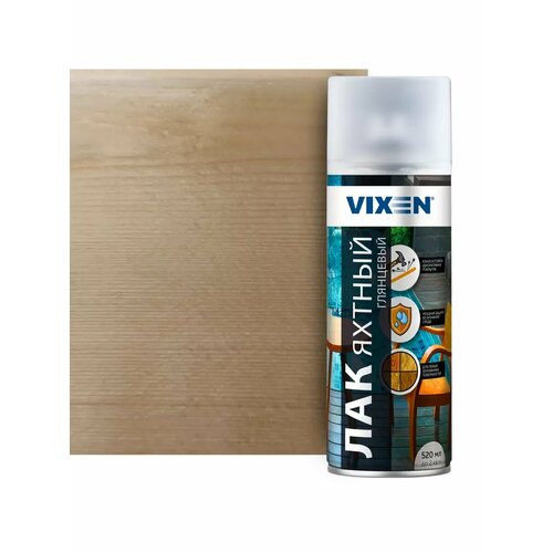 Лак яхтный Vixen — универсальный лакокрасочный материал для любых деревянных поверхностей, которые подвергаются атмосферному воздействию. Представляет собой однокомпонентный состав на алкидно-уретановой основе. Создает высокопрочное глянцевое покрытие, устойчивое к воздействию солнечных лучей, солёной и пресной воды, моющих средств, к перепадам температур. Надежно защищает древесину от вредоносных микроорганизмов.Выпускается в форме аэрозоля, что позволяет равномерно наносить материал на поверхности со сложной геометрией и работать в труднодоступных местах. Объем баллона — 520 мл. Расход лака 70-140 г/м^2^ в зависимости от плотности нанесения. Страна производства товара — Россия.Особенности примененияЛак наносят на очищенную и обезжиренную поверхность в 2-3 слоя с промежуточной сушкой в течение 10-15 минут.Работы выполняют при температуре не ниже +10 °С.Материал содержит легковоспламеняющиеся элементы — при нанесении следует соблюдать правила пожарной безопасности.Покрытие высыхает «на отлип» за полчаса, время полного высыхания — не менее трех часов.