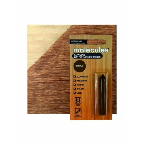 Карандаш для реставрации трещин Molecules оттенка «бамбук» предназначен для быстрой маскировки небольших повреждений, царапин, стыков, сколов на деревянной мебели, предметах декора, ламинате, паркетной доске, пластике, поверхностях из ДСП, МДФ и фанеры.Твердый воск можно использовать как в жилых помещениях, так и на террасах и в местах с повышенной влажностью. Подходит для восстановления оконных рам внутри дома, хорошо сцепляется с поверхностью, не смывается, не окисляется, долго сохраняет защитные свойства.Преимущества воскового карандаша:отталкивает влагу;визуально обновляет деревянные поверхности;сохраняет рельеф древесины;излишки легко удаляются спиртом.Длина карандаша — 64 мм. Страна производства — Россия.