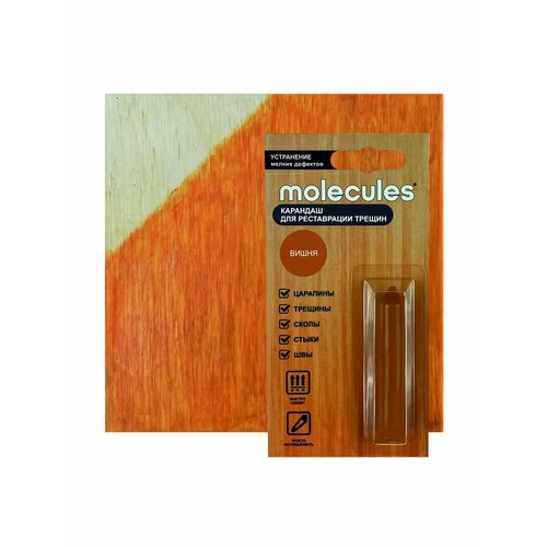 Карандаш для реставрации трещин Molecules оттенка «вишня» предназначен для быстрой маскировки небольших повреждений, царапин, стыков, сколов на деревянной мебели, предметах декора, ламинате, паркетной доске, пластике, поверхностях из ДСП, МДФ и фанеры.Твердый воск можно использовать как в жилых помещениях, так и на террасах и в местах с повышенной влажностью. Подходит для восстановления оконных рам внутри дома, хорошо сцепляется с поверхностью, не смывается, не окисляется, долго сохраняет защитные свойства.Преимущества воскового карандаша:отталкивает влагу;визуально обновляет деревянные поверхности;сохраняет рельеф древесины;излишки легко удаляются спиртом.Длина карандаша — 64 мм. Страна производства — Россия.