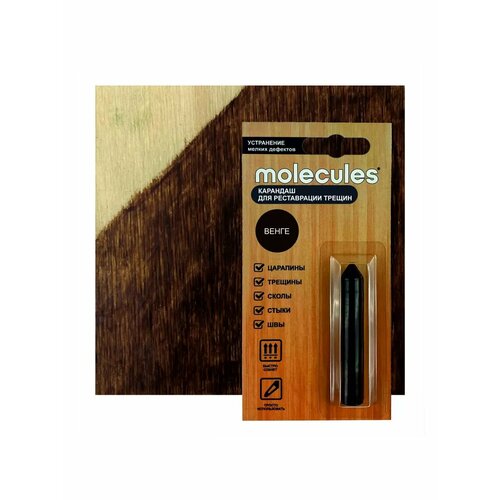 Карандаш для реставрации трещин Molecules оттенка «венге» предназначен для быстрой маскировки небольших повреждений, царапин, стыков, сколов на деревянной мебели, предметах декора, ламинате, паркетной доске, пластике, поверхностях из ДСП, МДФ и фанеры.Твердый воск можно использовать как в жилых помещениях, так и на террасах и в местах с повышенной влажностью. Подходит для восстановления оконных рам внутри дома, хорошо сцепляется с поверхностью, не смывается, не окисляется, долго сохраняет защитные свойства.Преимущества воскового карандаша:отталкивает влагу;визуально обновляет деревянные поверхности;сохраняет рельеф древесины;излишки легко удаляются спиртом.Длина карандаша — 64 мм. Страна производства — Россия.