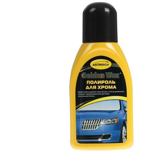 Полироль хрома Астрохим Golden Wax 250 мл, Полироль для хрома, серия Golden WaxПолироль для хромированных деталей – уникальный состав для очистки, восстановления и защиты всех хромированных поверхностей, а также изделий из алюминия, меди, латуни и нержавеющей стали. Быстро и эффективно удаляет пятна въевшейся грязи, потускнение, ржавчину и окисление, придавая колёсам, бамперам, декоративной отделке кузова зеркальный блеск. Способ применения:Вымойте кузов. Рекомендуем использовать автошампунь ASTROhim. Протрите насухо замшей или чистой тканью. Хорошо встряхните флакон и равномерно нанесите состав на обрабатываемые детали круговыми движениями с помощью губки или чистой мягкой ткани. Дайте подействовать составу (1-2 мин и отполируйте мягкой тканью.Для сильно окисленных деталей может потребоваться повторная обработка. Массивные элементы обрабатывайте частями, нанося состав на небольшие участки.