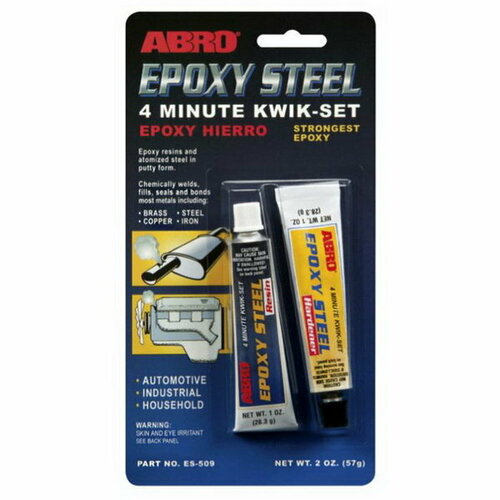 Клей эпоксидный ABRO высокопрочный авто 4 минуты 57 г - содержит эпоксидные смолы и измельченную сталь. Применяется для химической сварки, заполнения, герметизации и склеивания дерева, пластика и большинства металлов, включая латунь, сталь, медь, железо, и т. п. Надежно склеивает и обеспечивает хороший внешний вид. Устойчив к бензину, антифризу и большинству растворителей. Эпоксидный клей может применяться для: сломанных велосипедов, растрескавшихся картеров коробки передач, тормозных колодок, всасывающих труб, поврежденных шпоночных канавок, трещин в обшивке, растрескавшейся батареи, бензобаков.Применение: Булавкой или каким-либо острым предметом проколите выпускное отверстие тюбика герметика. Ремонтируемая поверхность должна быть очищена от грязи, высушена и обезжирена. Выдавите из тюбиков равные порции основы и отвердителя и тщательно перемешайте до достижения однородного цвета. Смешивайте только то количество, которое будет немедленно использовано, так как затвердевает клей за 4 минуты. Если температура окружающей среды ниже 5 °С, то затвердевает клей дольше. Смесь будет теплой до тех пор, пока не отвердеет. Аккуратно нанесите эпоксидный клей на склеиваемые поверхности. Для схватывания материала зажимы не требуются, нужно только слегка сжать склеиваемые детали. Меры предосторожности: если эпоксидный клей попал на кожу, тщательно смойте его водой и мылом. При попадании в глаза промойте их водой. В случае проглатывания эпоксидного клея не следует вызывать рвоту. Немедленно обратитесь к врачу. Без запаха. Не огнеопасен. Хранить в местах недоступных для детей. Объем/вес: 57 г (тюбик)