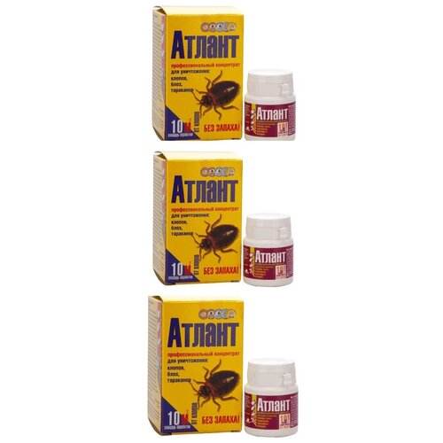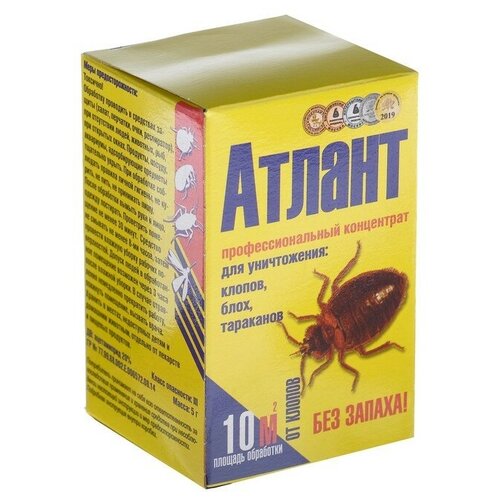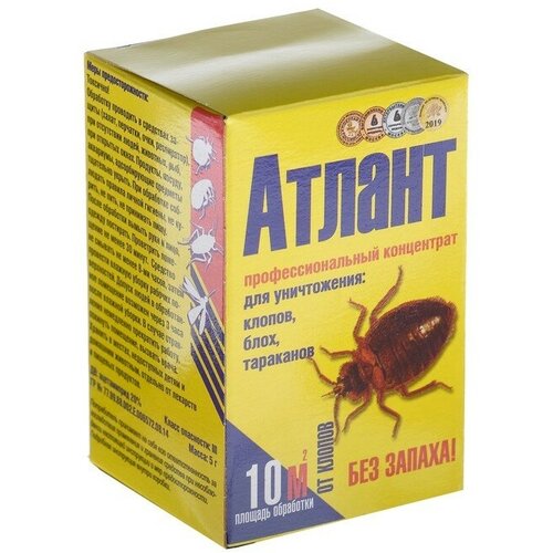 Средство представляет собой мелкодисперсный порошок голубого или белого цвета, который необходимо растворить в воде. Не оставляет следов на поверхности и образует стойкую невидимую плёнку. После контакта с ней насекомые гибнут в течение нескольких минут.Благодаря активному действующему веществу «Атлант» справляется с клопами, которые устойчивы к большинству средств. Содержимое упаковки рассчитано на приготовление 1 литра раствора для обработки до 10 м².Действующее вещество: ацетамиприд (20 %).Назначение: для гарантированного уничтожения клопов, тараканов, блох, крысиных клещей.