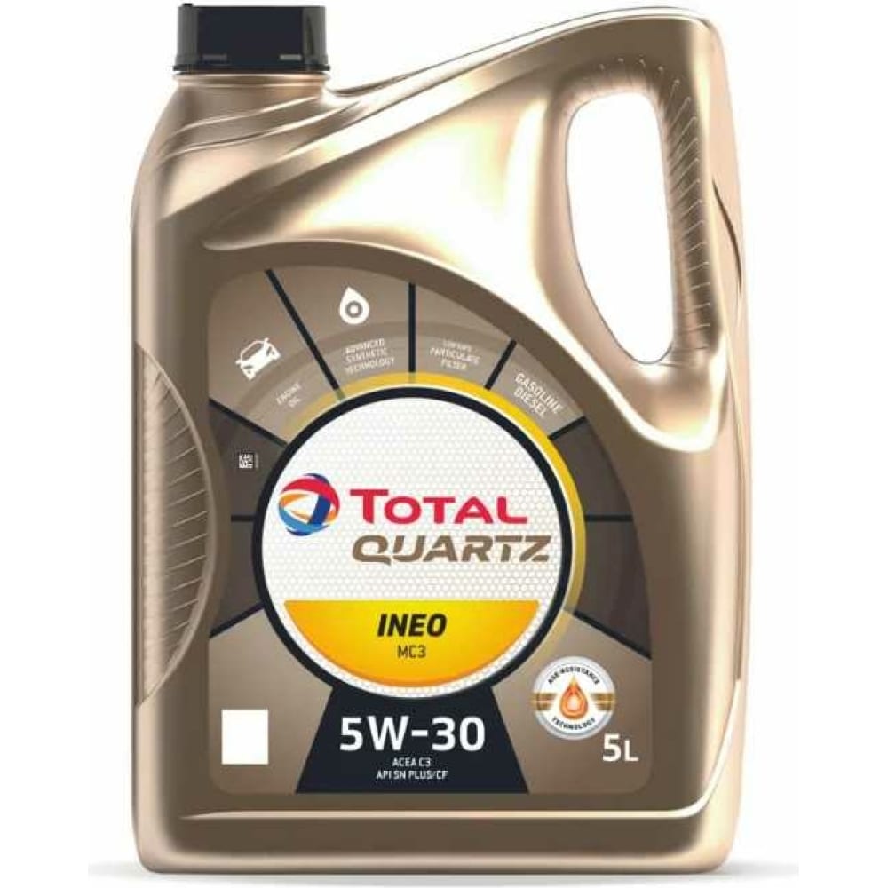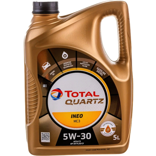 Масло для 4-х тактных двигателей TOTAL (11772) QUARTZ INEO MC3 5W30, 5 л 213698 разработано согласно техническим требованиям таких автопроизводителей, как BMW, Mercedes-Benz, Volkswagen и Hyundai/Kia.TOTAL QUARTZ INEO MC3 5W-30 соответствует последним международным стандартам ACEA и API и отвечает требованиям большинства автопроизводителей.Моторное масло с классом вязкости 5W-30 подходит для наиболее жестких условий эксплуатации транспортного средства (спортивное вождение, частые пуски, движение по городу и автомагистралям).Специальный состав обеспечивает стойкость масла к экстремальным перепадам температур. Данное масло особенно подходит для современных мультиклапанных двигателей, оснащенных турбонаддувом и прямым впрыском.Технология Low SAPS (низкое содержание сульфатной золы, серы и фосфора) делает данное масло оптимальным выбором для безупречной работы двигателей последних поколений, оснащенных системами очистки выхлопных газов.ACEA C3;API SNPlus/CF;MB-Approval 229.52;BMW LL-04;HYUNDAI – KIA: Одобрено Hyundai Kia и рекомендовано в качестве масла сервисной заливки;GENERAL MOTORS: Официальная лицензия Dexos 2 TM: GB2C0301070. Отвечает последним техническим требованиям двигателей GM (Opel, Vauxhall, Chevrolet);Подходит для применения в случаях, когда необходима спецификация VW 505.01;CHRYSLER: MS-11106 (level).
