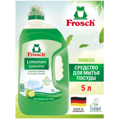 Средство для мытья посуды Лимон Frosch (Фрош) 5л . Отмывает посуду до блеска. Состав со свежим экстрактом зеленого лимона и растительными ПАВ легко удаляет жир и грязь, а также защищает и ухаживает за кожей рук.