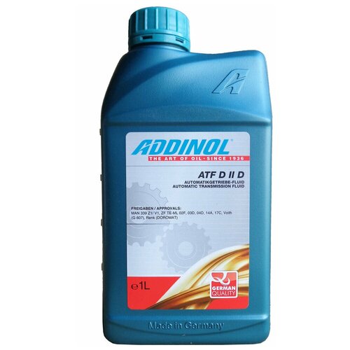 ADDINOL ATF D II D - трансмиссионное масло на основе рафинатов минеральных масел для автоматических коробок передач автомобилей, усилителей рулевого привода, можно использовать в легковых, грузовых автомобилях и автобусах. Жидкости для автоматических коробок передач ADDINOL ATF D II D используются: в полуавтоматических и автоматических коробках передач легковых и грузовых автомобилей, автобусов и прочих видов транспортных средств с замедлителем и без него; в гидродинамических преобразователях; в гидравлических системах и гидравлических усилителях рулевого привода (сервопривод рулевого управления) легковых и грузовых автомобилей.